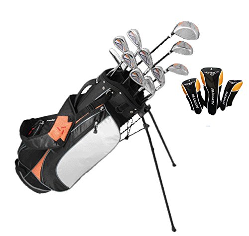 2 GRAPHITE SHAFTED WOODS WITH MATCHING HEAD COVERS. 1 GRAPHITE SHAFTED HYBRID #4 WITH HEADVER. STEEL SHAFTED STAINLESS IRON #5, 6, 7, 8, 9, PW (PITCHING WEDGE). POPULAR PERFORMANCE SERIES PUTTER. 9 INCH LIGHTWEIGHT STAND BAG WITH RAINHOOD. BLADE STYLE PUTTER. AVAILABLE IN MENS. AVAILABLE IN LEFT-HAND & RIGHT-HANDED.